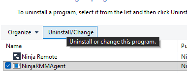 - Select it, then look to the top of the window and find the uninstall/change button, ensuring that you still have the NinjaRMM agent selected/highlighted